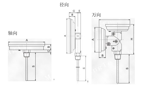 雙金屬溫度計是將繞成螺紋旋形的熱雙金屬片作為感溫器件,并把它裝在保護套管內,其中一端固定,稱為固定端,另一端連接在一根細軸上,稱為自由端。在自由端線軸上裝有指針。當溫度發生變化時,感溫器件的自由端隨之發生轉動,帶動細軸上的指針產生角度變化,在標度盤上指示對應的溫度。今天給大家分享一下徑向,萬向,軸向雙金屬溫度計的結構圖。